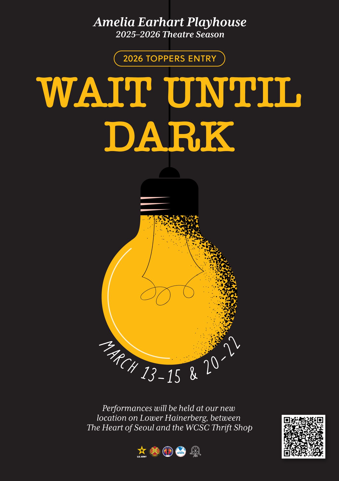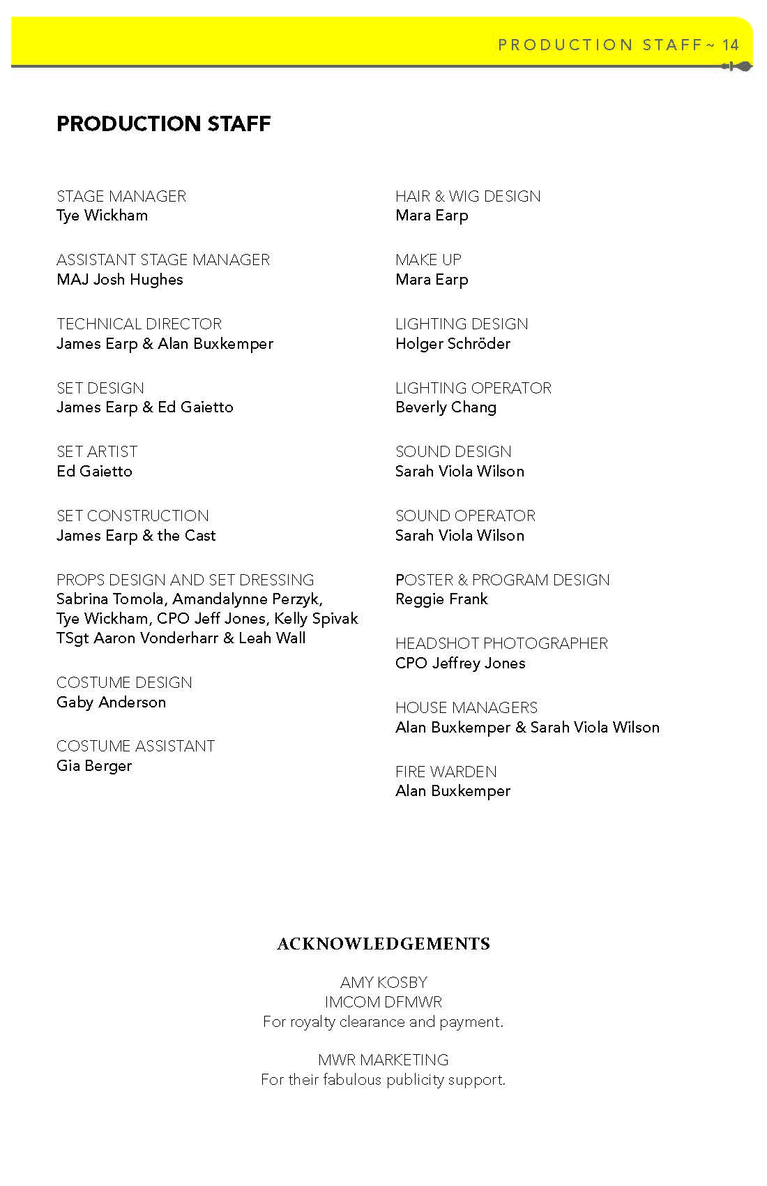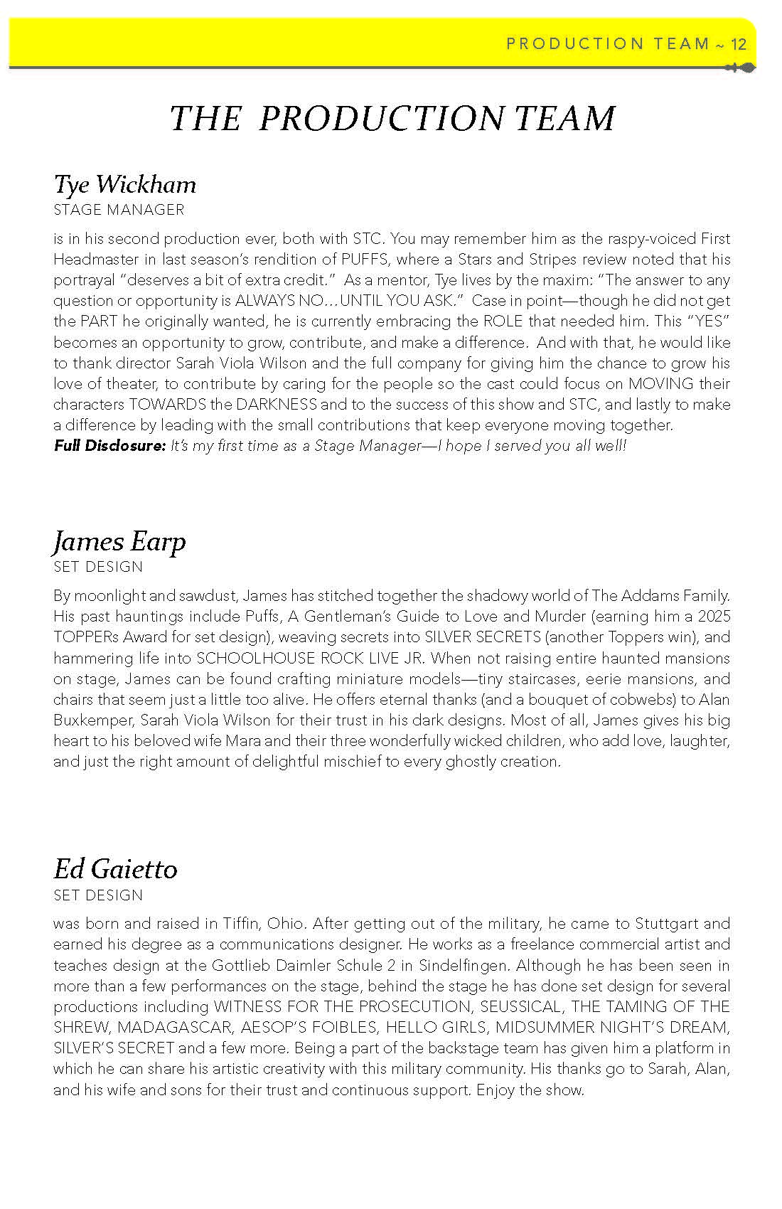 Dane has received numerous awards for his direction, set and lighting designs, and innovative programming. He was awarded with the AACT David C. Bryant Outstanding Service Award; the US Army Entertainment James T. Martin Lifetime Service Award; and numerous Commanders’ Achievement and Civilian Service Medals. Dane’s programming and theatre direction has earned four US Army Entertainment Irving Berlin Awards.