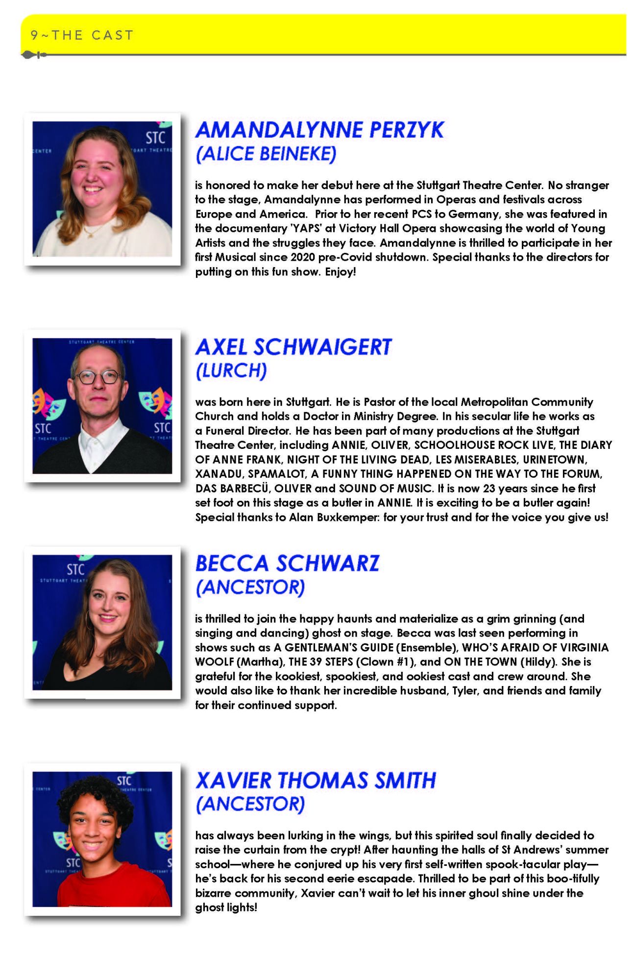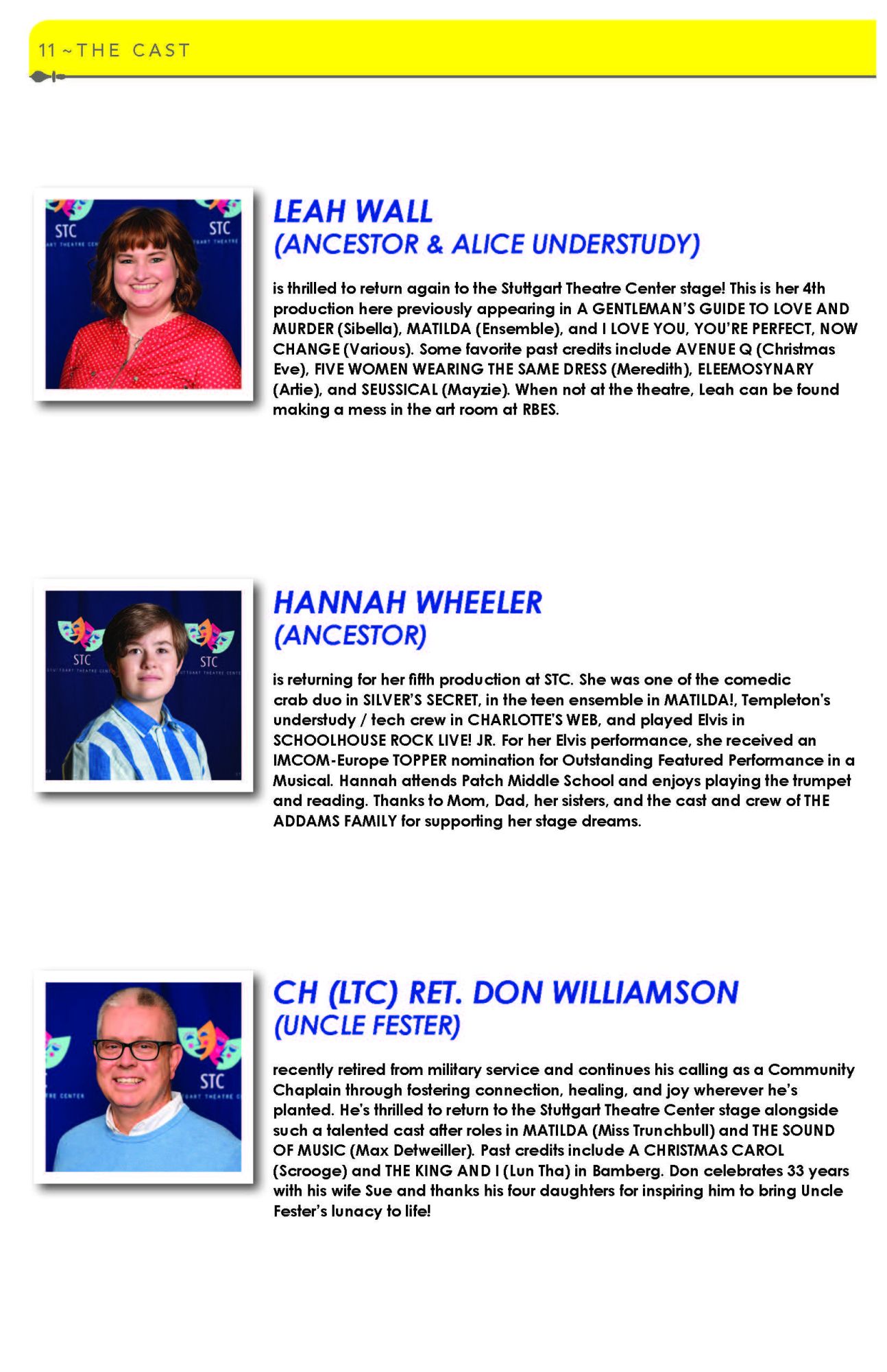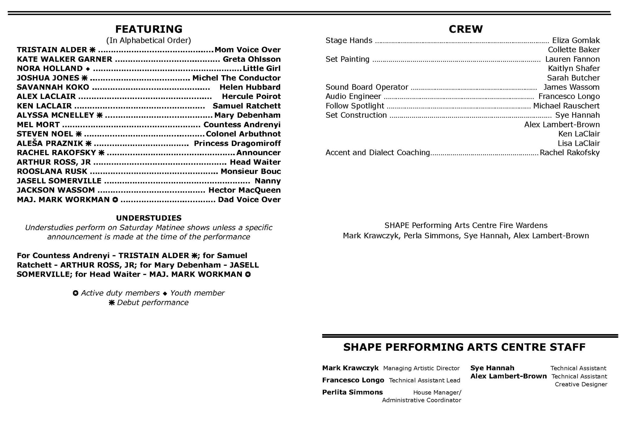 Dane has received numerous awards for his direction, set and lighting designs, and innovative programming. He was awarded with the AACT David C. Bryant Outstanding Service Award; the US Army Entertainment James T. Martin Lifetime Service Award; and numerous Commanders’ Achievement and Civilian Service Medals. Dane’s programming and theatre direction has earned four US Army Entertainment Irving Berlin Awards.