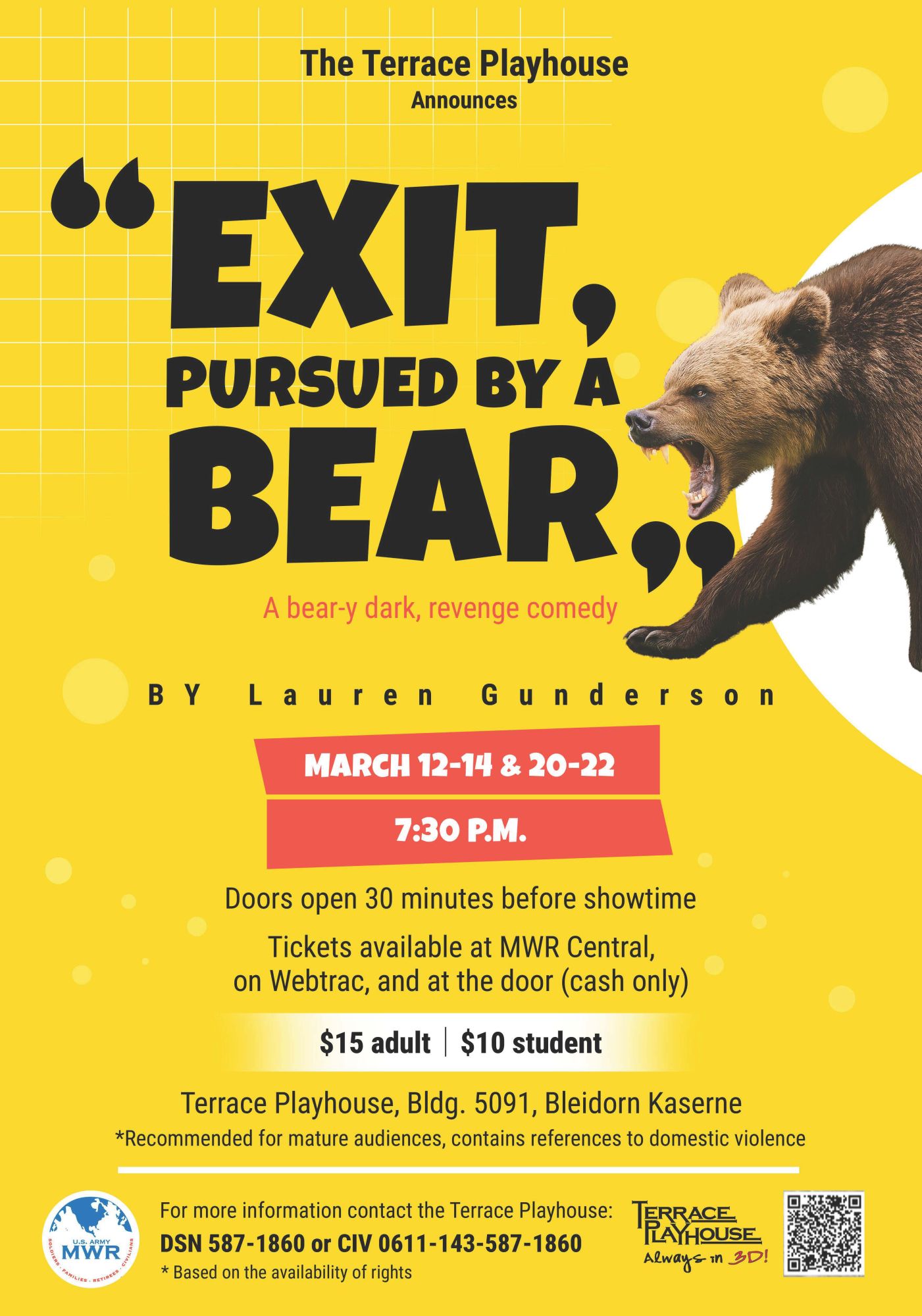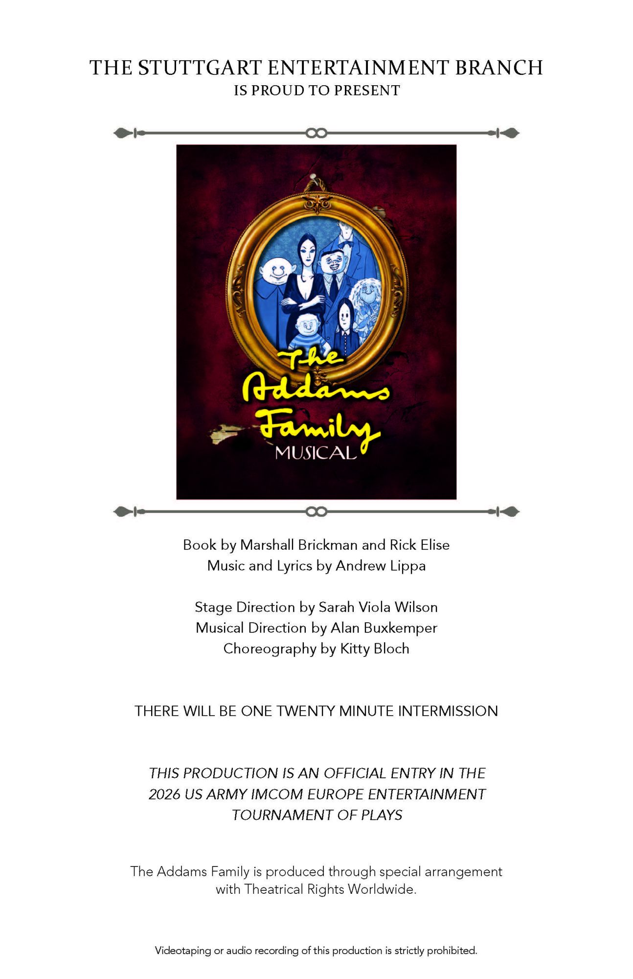 will be held 25 April 2026at the Wiesbaden Fitness Arena, Building 1631,Lucius D. Clay Kaserne, Wiesbaden, Germany.Awards Show AdmissionAdmission = $20Family Pass Admission = $50 (Two adults and 2 or more children, 18 yrs and younger)Awards Show & Ceremony Schedule1630: No-Host Cocktail Service (Optional)