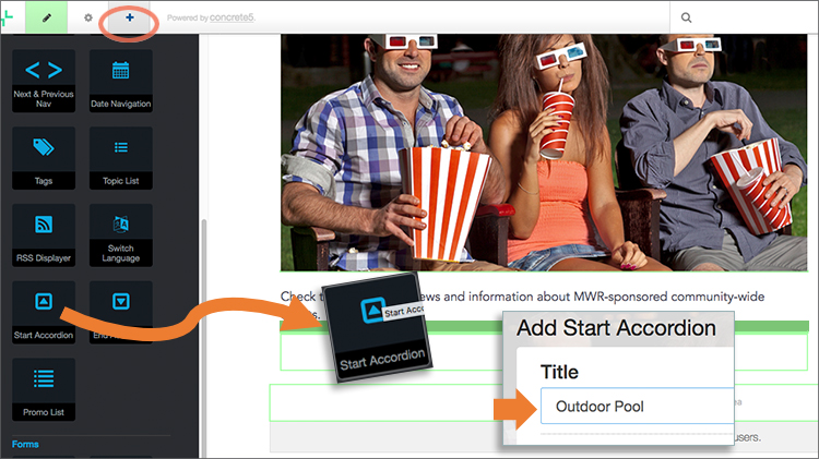 4. Open the blocks panel again and drag the Content icon directly under the blue bar. It will attach to the accordion title. The Edit panel will open. Add content and save.